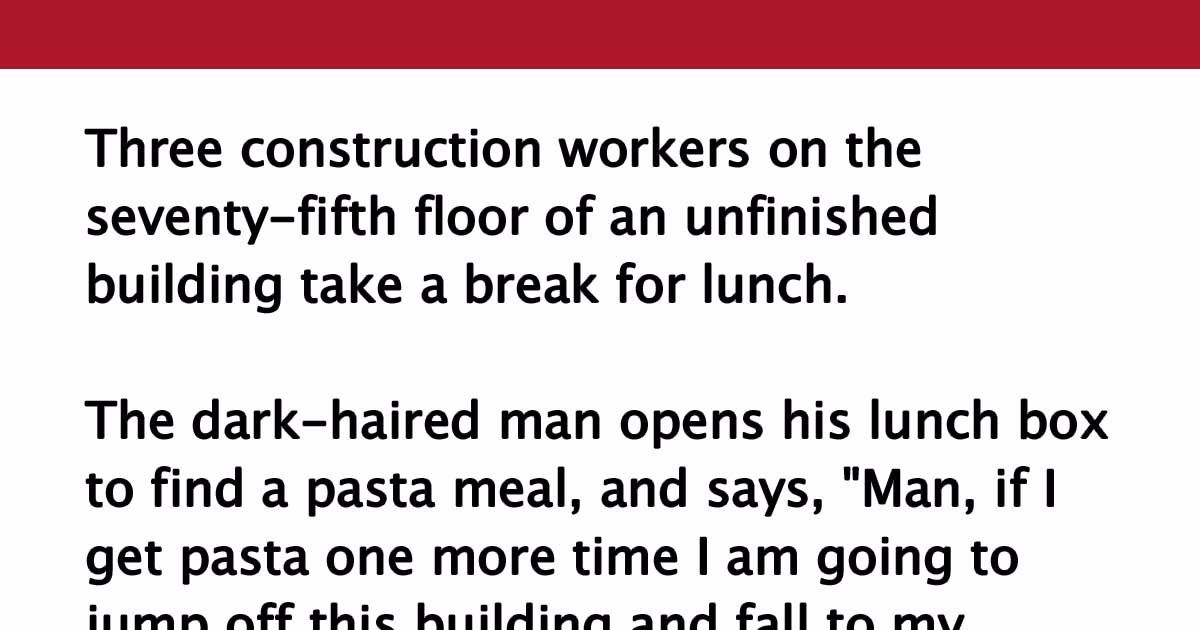 The dark-haired man opens his lunchbox to find a pasta meal, and says, "Man, if I get pasta one more time I am going to jump off this building and fall to my death!"